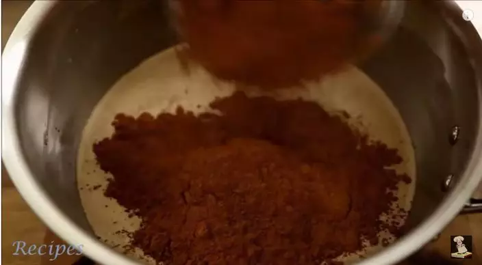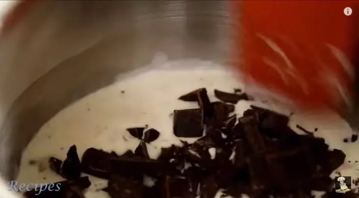 接著是準備流心漿,將2/3杯忌廉、8盎司朱古力倒進器皿用低火煮溶,再加2湯匙牛油以及1茶匙威士忌,酒份量可以按口味增減。