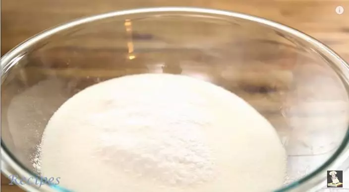 接著準備兩個大碗,將麵粉、砂糖、梳打粉和鹽倒進其中一個大碗拌勻備用。