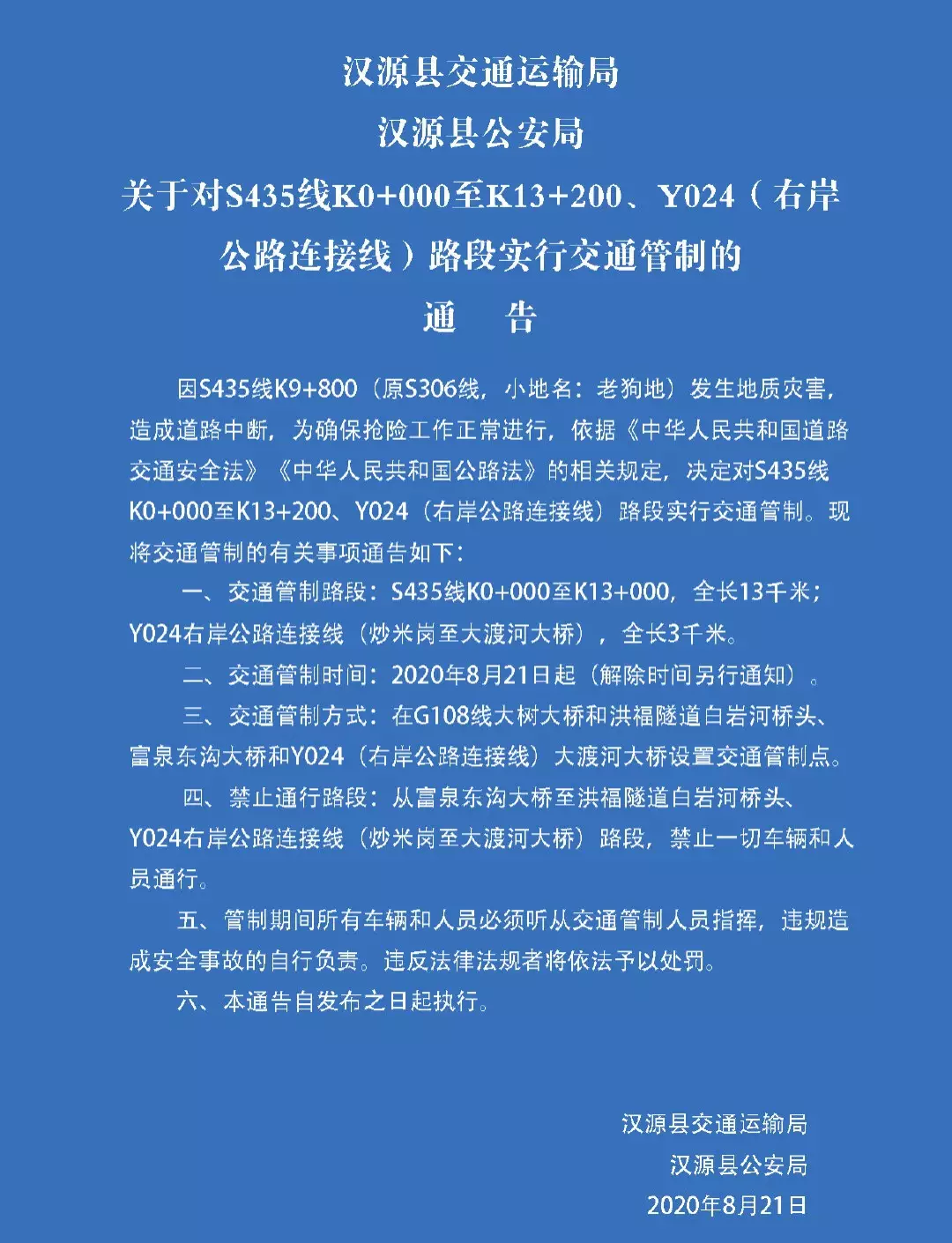 總台央視記者從四川雅安市公安局漢源縣公安局,漢源縣交通運輸局獲悉,因S435線K9+800(原S306線,小地名:老狗地)發生地質災害,造成道路中斷,為確保搶險工作正常進行,依據《中華人民共和國道路交通安全法》《中華人民共和國公路法》的相關規定,決定對435線K0+000至K13+200、Y024(右岸公路連接線)路段實行交通管制。現將交通管制的有關事項通告如下:
