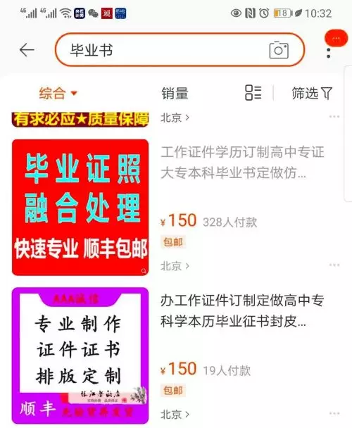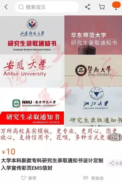 記者近日在淘寶網檢索關鍵詞「錄取通知書」發現,多家店鋪稱可定製高校錄取通知書,包括專科、本科、研究生錄取通知書。部分商品展示頁附有多家高校錄取通知書封面圖片。
