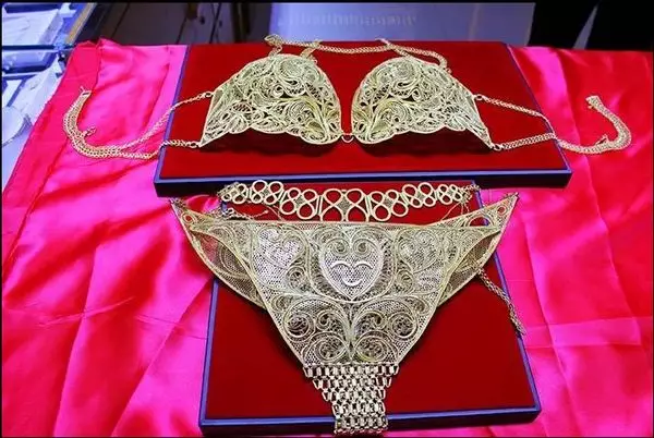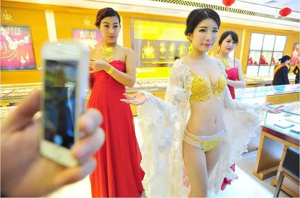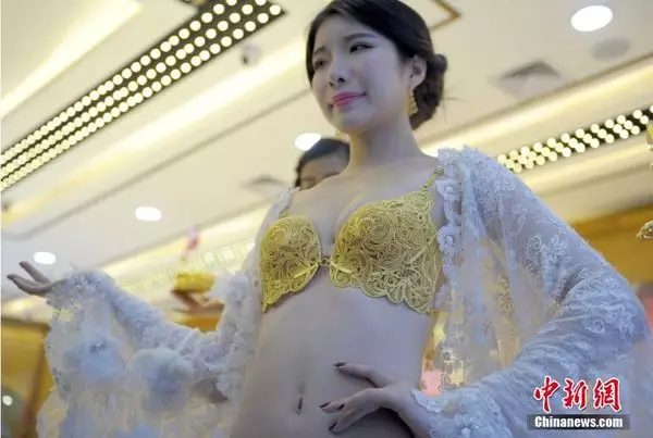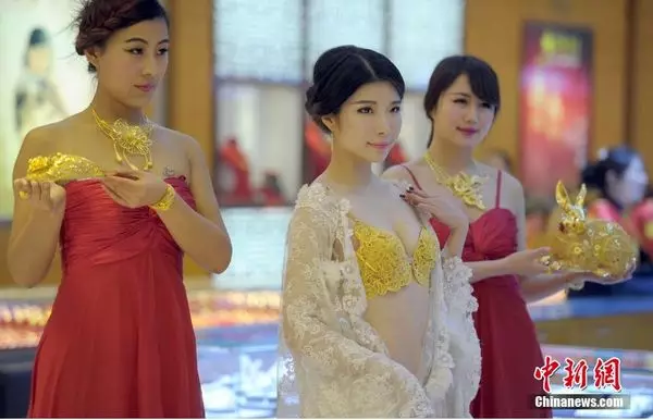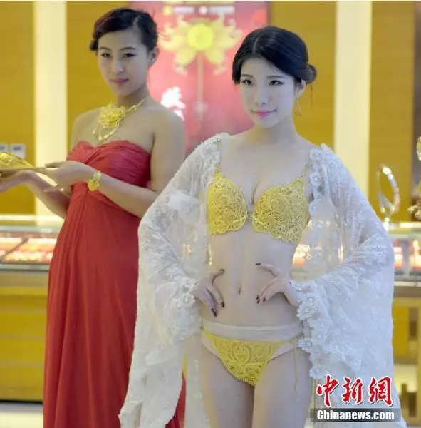 湖北武漢一間金飾店,為吸引民眾目光,日前找來一名索女,穿上由黃金打造的純金內衣,認真符合中國土豪風味!