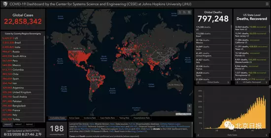 據美國約翰斯·霍普金斯大學最新疫情統計數據,截至北京時間今晨8時27分,全球累計新冠確診病例超過2285萬例,達22858342例;累計死亡病例近80萬例,達797248例。