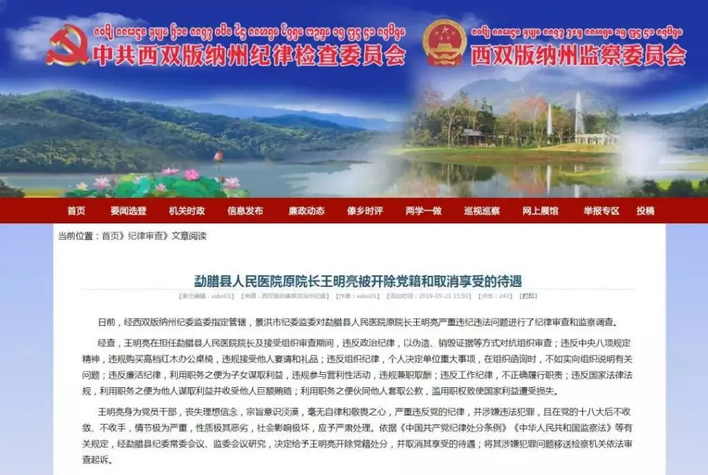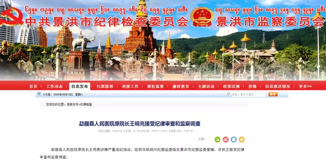 2018年11月,景洪市紀委監委網站發佈消息:勐臘縣人民醫院原院長王明亮涉嫌嚴重違紀違法,經西雙版納州紀委監委指定景洪市紀委監委管轄,目前正接受紀律審查和監察調查。