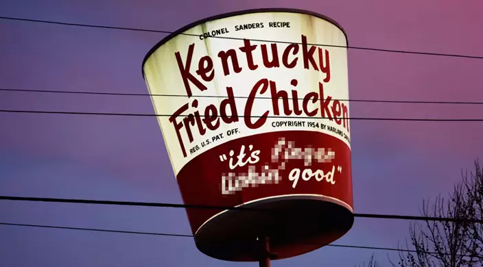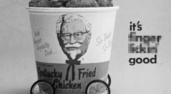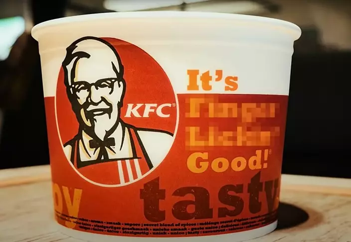 肯德基炸雞桶上的「Finger Lickin」被打上馬賽克。 影片截圖