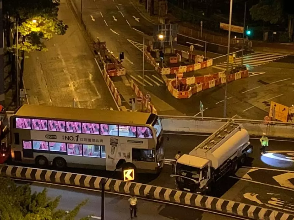 油麻地加士居道天橋今日凌晨發生交通意外,一輛運油車撞向路中分隔石壆,天橋往旺角方向一度全封。