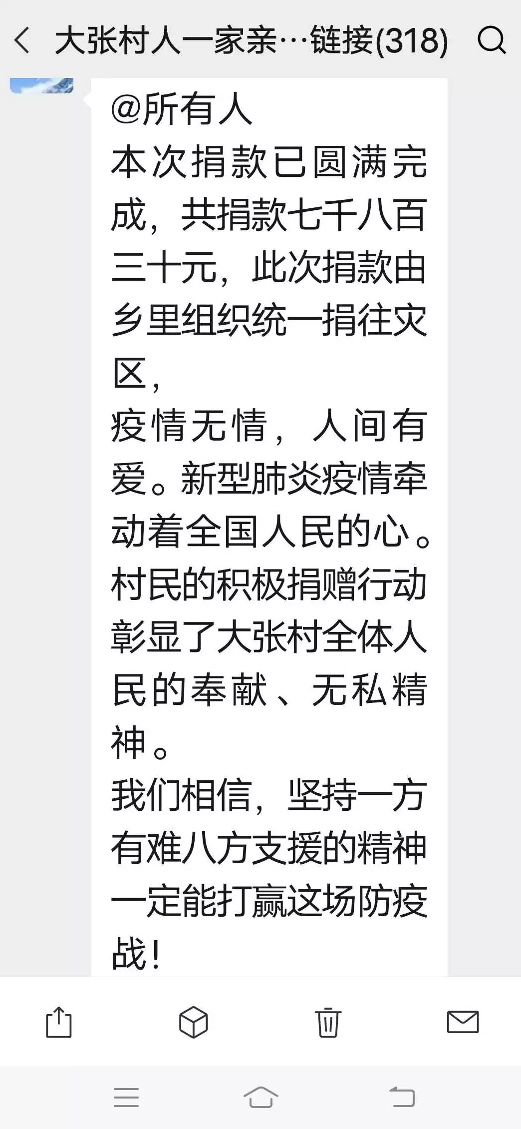反映該情況的村民告訴紅星新聞記者,大張庄村為抗擊疫情捐款發生在今年2月17日左右,當時村裡通過廣播及在微信群內發通知,號召大家捐款。「村民都挺踴躍的,有去村支部捐的現錢,也有通過微信轉給村幹部。然後村幹部說是登記造冊後送到鎮裏去,由鎮上統一安排這個事。」