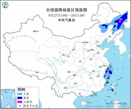中央氣象台預計,27日14時至28日14時,黑龍江中東部、吉林大部、遼寧北部、內蒙古東南部以及浙江大部、上海、福建北部和東部、台灣島南部等地部分地區有大到暴雨,其中,黑龍江中部等地局地有大暴雨(100~140毫米)。