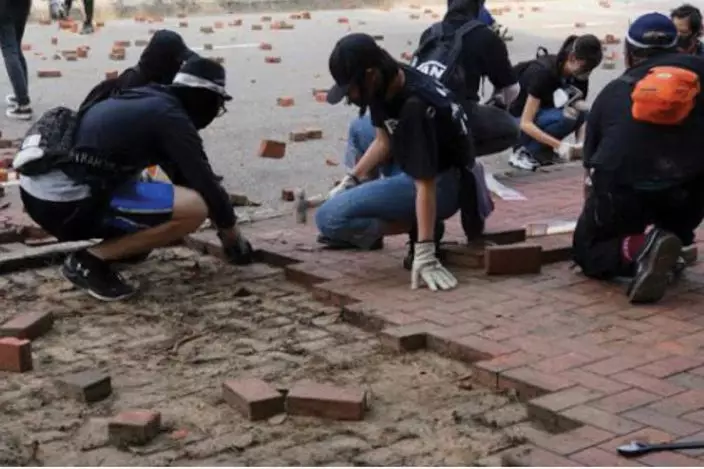 831有400人在太子站路面掘磚,掘磚是暴徒的例行「工序」。