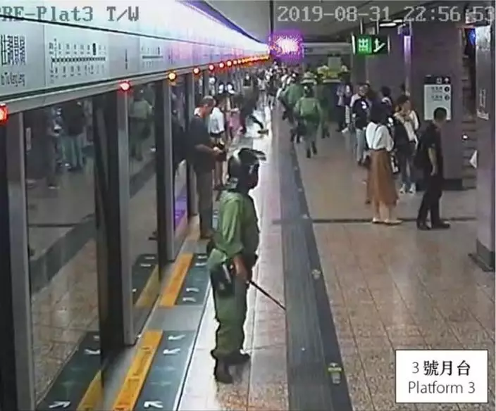 8.31當晚10時56分,港鐵太子站3號月台的閉路電視拍攝得,防暴警察抵達3號月台。港鐵閉路電視截圖