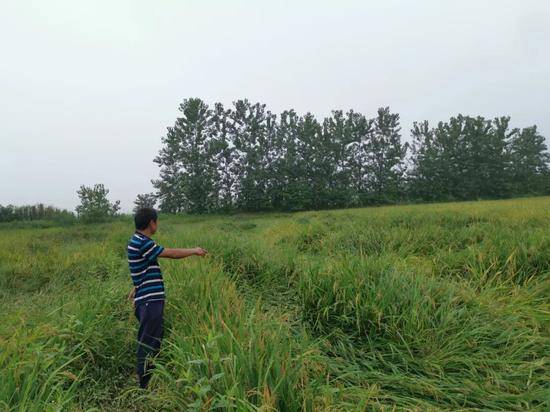 7月16日,湖南省岳陽市一處大面積倒伏的稻田。新華社記者周楠 攝