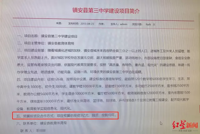 原鎮安縣教體局2013年發佈的招商信息顯示,預算投資金額為3億元 圖據鎮安縣政府官網