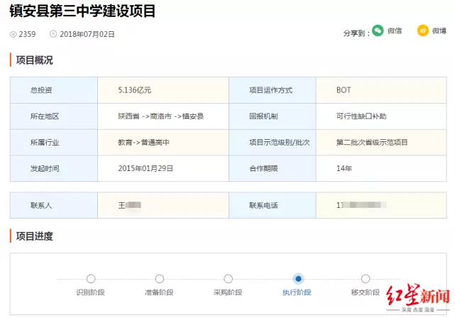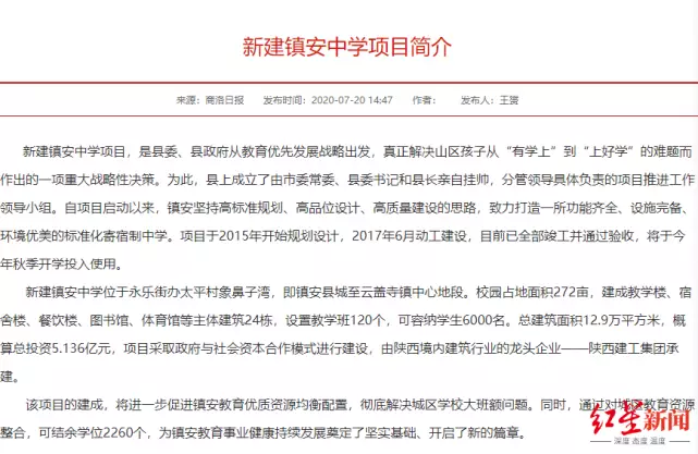 公開信息顯示,2016年7月25日,鎮安縣政府研究批准三中項目採取政府與社會資本合作模式(PPP模式)進行投融資建設。當年11月17日,陝西華夏招標有限公司受鎮安縣科技和教育體育局的委託進行招標。