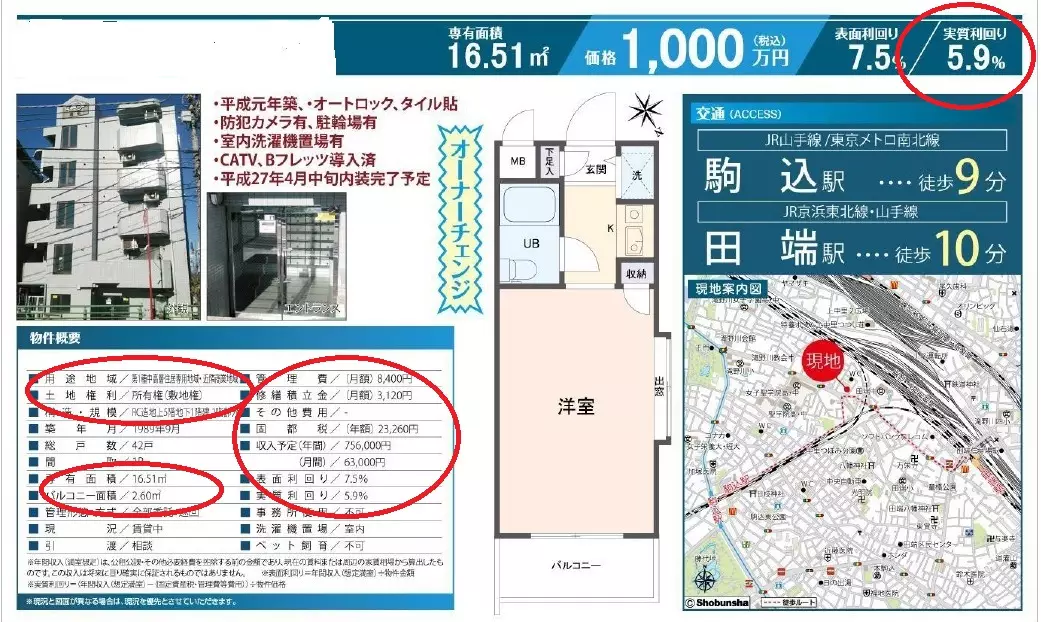 4. 租金回報:大家最關心的一項當然是租金收入。以圖中單位為例,售價1千萬円,表面回報率7.5%(即圖中“表面利回り”),扣除所有費用後實際回報是5.9%(圖中“実質利回り”)。這比例是根據公寓目前月租6萬3千円、全年租出的總數計算出來,如果途中租客走了重新招租的成本就不計算在內。所以,投資的話最好找有租客的,起碼馬上有收入。