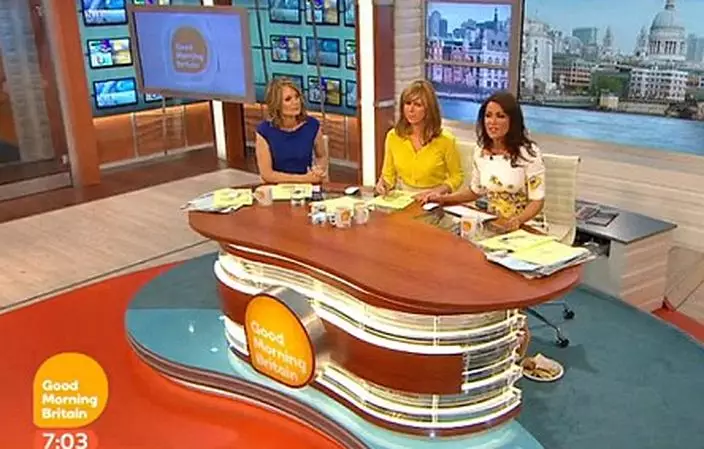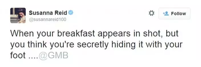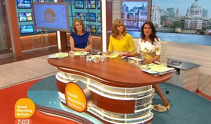 英國獨立電視台女主播蘇珊娜(Susanna Reid),近日在主持《英國早晨》直播節目時,因擔心擺放在地上的早餐碟穿崩,於是一邊主持節目,一邊腳撩撩,將早餐碟踢入枱底。