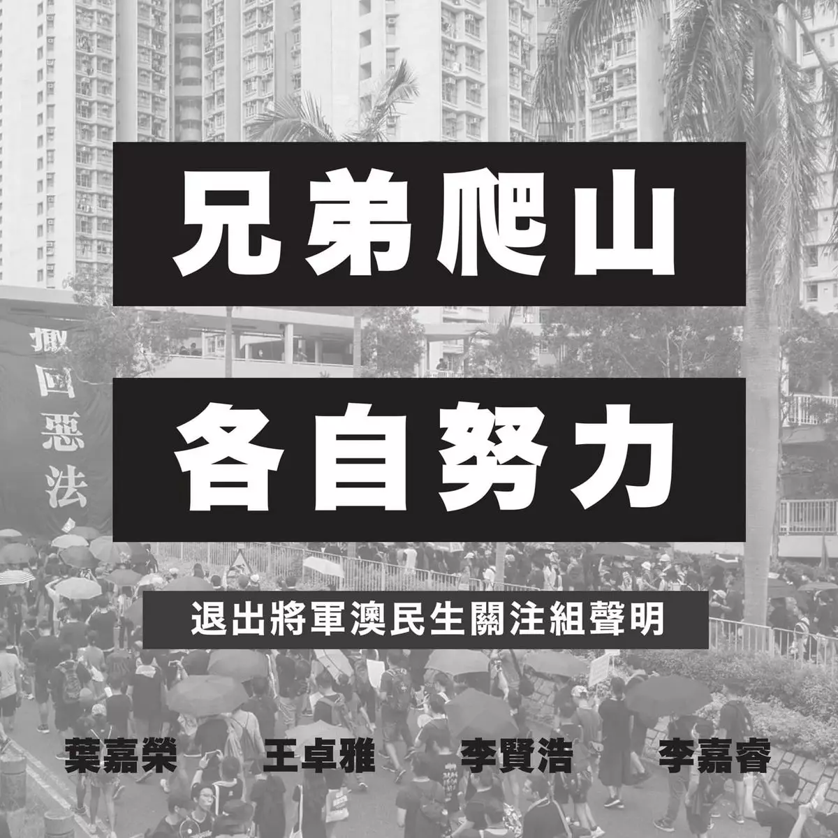 王卓雅、李賢浩、李嘉睿及葉嘉榮今日在社交媒體發表聯合聲明指,已通知將軍澳民生關注組,即日起辭退將所有職務及退出將民關,並衷心感謝各位過去數年對他們的支援及教導,期望日後將民關在地區發展的路上有更好的前景。