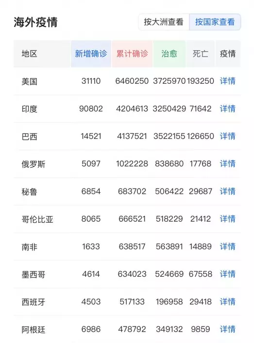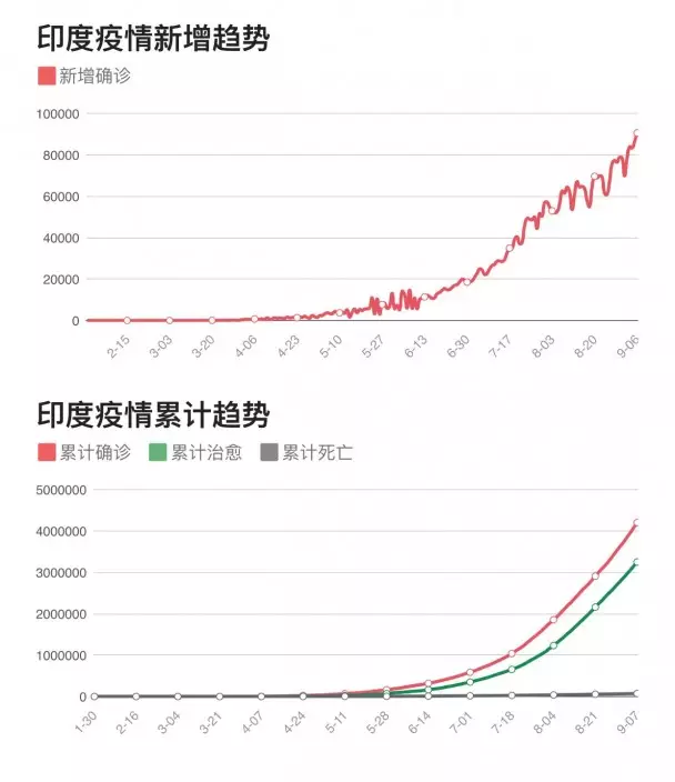 根據印度衛生和家庭福利部的數據,該國目前記錄在案的病例總數為420萬例,其中包括71642例死亡。全球排第一的美國現有確診總數646萬,但昨天美國單日確診31110例。