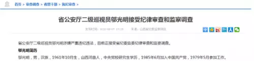 9月7日,山西省紀委監委發佈消息,山西省公安廳二級巡視員鄔光明涉嫌嚴重違紀違法,目前正接受山西省紀委監委紀律審查和監察調查。