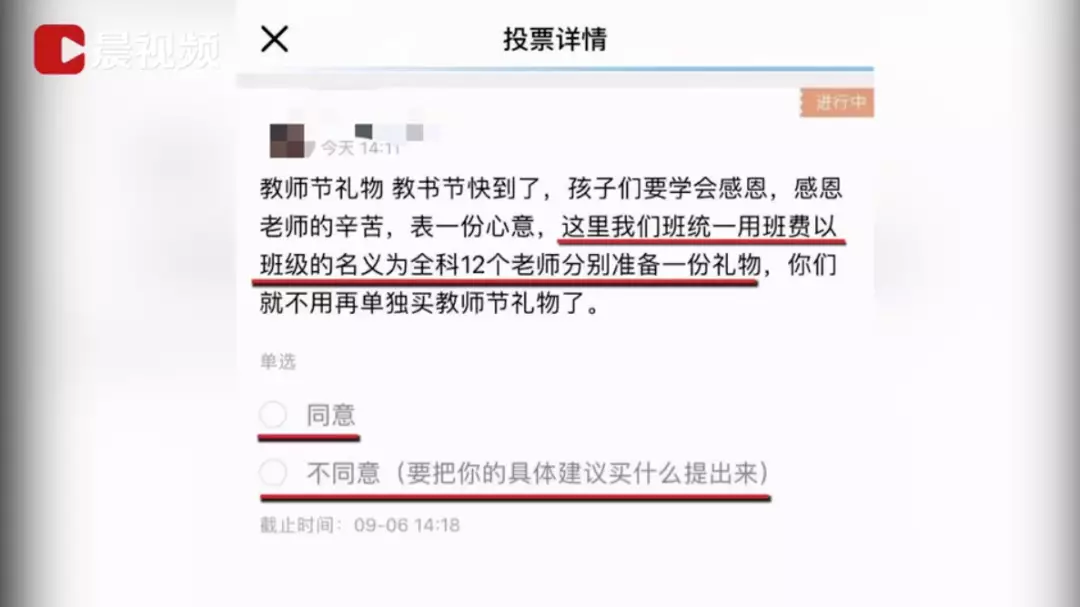 在投票界面,班主任寫到:孩子們要學會感恩,感恩老師的辛苦,表一份心意,這裏我們班統一用班費以班級的名義為全科12個老師分別準備一份禮物,你們就不用再單獨買教師節禮物了。