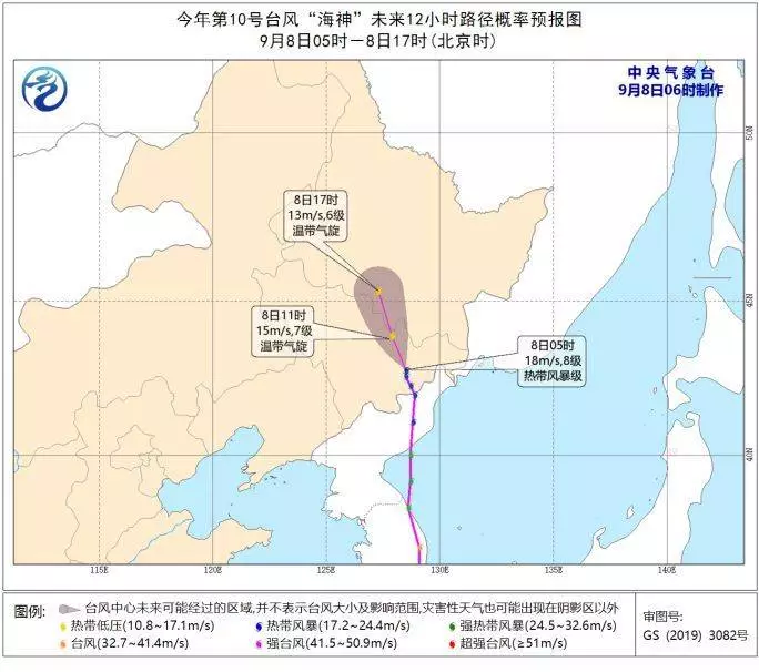 今年第10號颱風「海神」已於昨天(7日)夜間在朝鮮北部由強熱帶風暴級減弱為熱帶風暴級,並於今天(8日)凌晨3點鐘前後移入吉林省和龍市境內,早晨5點鐘其中心位於吉林省安圖縣境內,就是北緯42.8度、東經128.5度,外圍最大風力有8級(18米/秒),中心最低氣壓為988百帕。