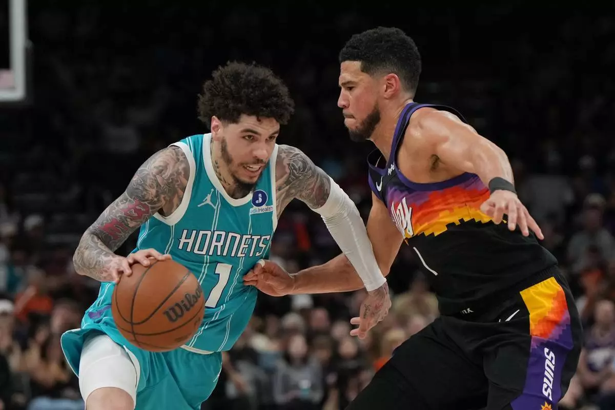 夏洛特黃蜂隊後衛拉美路波爾(1號),突破鳳凰城太陽隊後衛戴雲布加的防守。 AP圖片