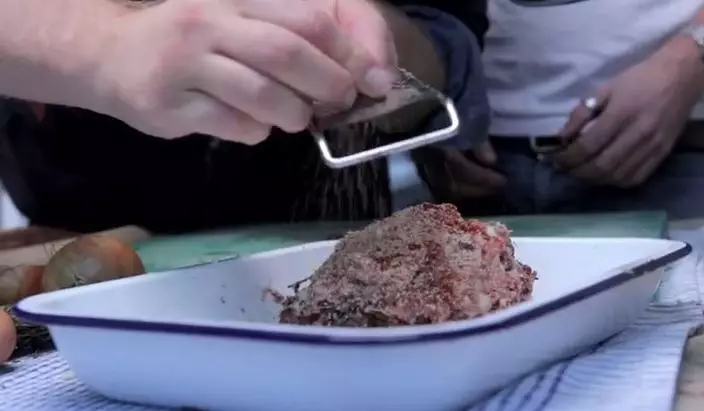 將切碎的洋蔥「撈」入豬肉碎,再以少量鹽、香草與黑椒等調味。