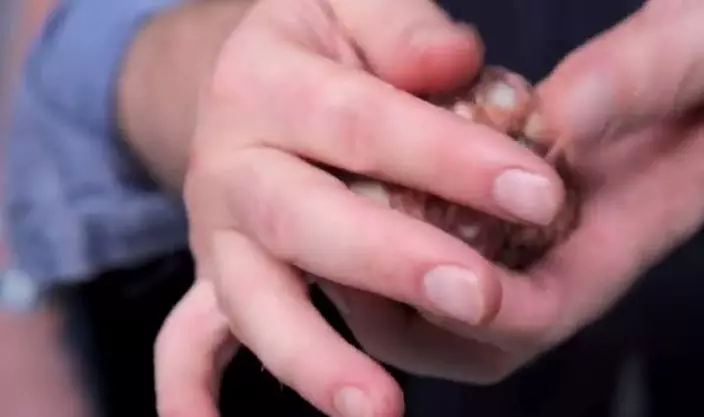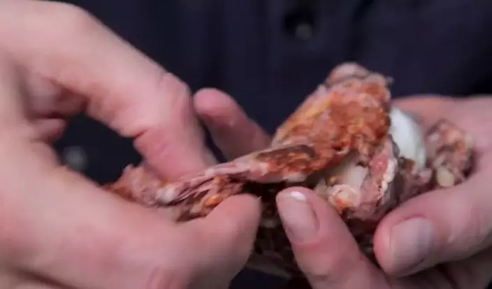 慢慢將壓平的肉碎徹底包着冷凍的剝殼雞蛋。