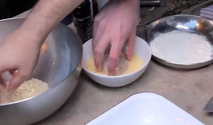 之後另外打一隻雞蛋加入少許牛奶拌勻,再按次序將肉團沾滿麵粉、浸入蛋液、再灑上麵包糠。