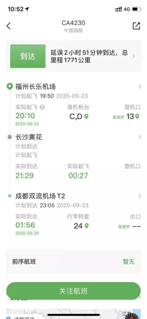 南都記者查詢「飛常准」獲悉,CA4230於當天20時10分從福州長樂機場出發,放行時一切正常,目的地成都。飛行軌跡顯示,在起飛50分鐘後,該航班於當天21時開始從10000米高空下降,隨後約在20分鐘時間內從萬米下降到3400米高度,航班實際於當天21時29分備降在長沙黃花機場。對於備降原因,「飛常准」顯示系「旅客原因-醫療緊急情況」。