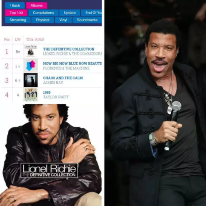 66歲美國老牌流行樂手Lionel Richie在英國格拉斯頓伯利音樂節演出後,03年與The Commodores發行的精選大碟《The Definitive Collection》躍升本周英國流行音樂專輯榜榜首,是他相隔23年後再奪冠。