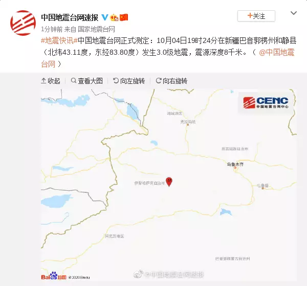 中國地震台網正式測定:10月04日19時24分在新疆巴音郭楞州和靜縣(北緯43.11度,東經83.80度)發生3.0級地震,震源深度8千米。( @中國地震台網 )