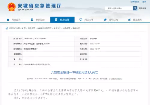 7日上午,安徽省應急管理廳已經通報了事故情況:10月6日14時58分許,六安市金寨縣天堂寨鎮馬石村三叉路口向南約500米處,一車輛衝撞護欄後墜落河中,車內兩男一女被民警救出,經120現場搶救多時後宣佈死亡。
