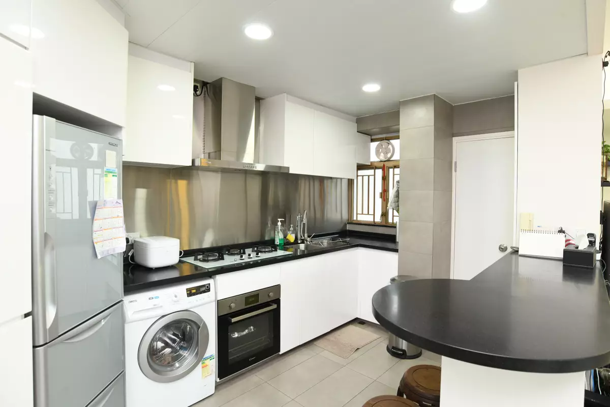 立刻帶大家走訪單位,位於1座中層B室,實用面積948方呎。開門後,需先經小玄關才抵大廳,淺色系布置的廳堂顯得清新,落地大窗由飯廳伸延至客廳,為一室引進充沛自然光。客廳於擺放L形沙發後仍有充裕活動空間;飯廳則簡單放有木餐桌,旁邊設有中島枱面及開放式廚房,令家居更感開闊通透,廚房一隅設有貯物房,使大型物件亦能收納得宜。