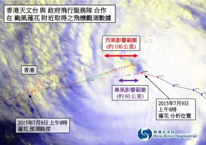 昨晚8號風球只掛了5個鐘就匆匆除下,掛風球期間,不少市民都紛紛指「蓮花」「無料到」,無風又無雨,不知為何要掛8號波。香港天文台凌晨發新聞稿解畫。天文台表示,他們和政府飛行服務隊合作,派定翼機於蓮花風眼附近範圍作出氣象觀測。飛機數據顯示昨日上午7時至9時蓮花風眼附近錄得颶風風速(每小時118公里或以上),烈風範圍亦約有一百公里。當時預料蓮花會向西至西南偏西方向移動,在傍晚非常接近香港,對本港構成威脅。