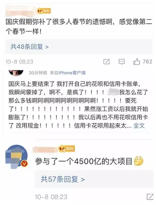 很多網友這樣評價這個黃金周,「好像有魔力,不知不覺就花了幾千元,沒有5000元都不好意思往外曬。」還有網友稱,“國慶假期彌補了很多人春節的遺憾,就像第二個春節一樣。”