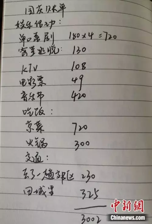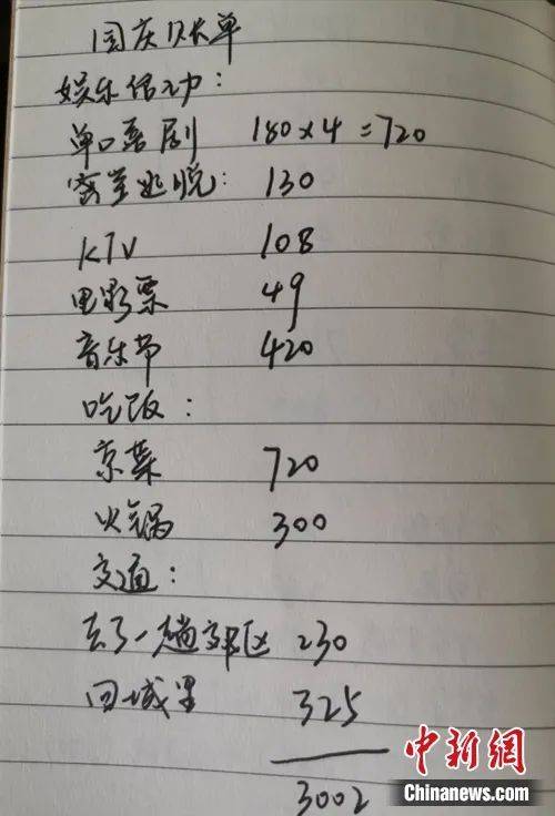 節後,這些項目變成了一摞賬單。「沒細算呢,大概有7000元,感覺還好,這種大節日,沒有5000元根本就過不去,就這,我們還沒有遠行旅遊呢。」 沈文稱。