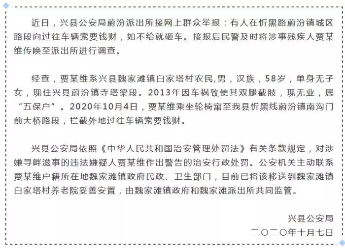 通報指出,近日,興縣公安局蔚汾派出所接網上群眾舉報:有人在忻黑路蔚汾鎮城區路段向過往車輛索要錢財,如不給就砸車。接報後民警及時將涉事殘疾人賈某維傳喚至派出所進行調查。