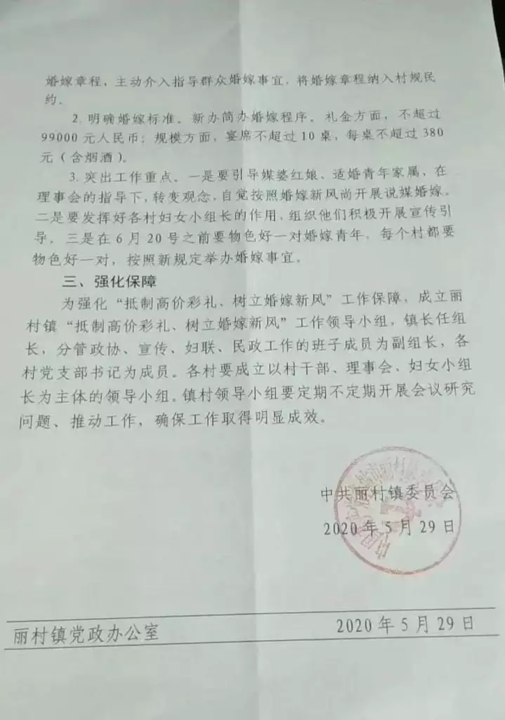 豐城市麗村鎮印發紅頭文件要求抵制高價彩禮、樹立婚嫁新風,禮金不超過99000元人民幣,辦席不超過10桌,每桌不超過380元(含煙酒)。