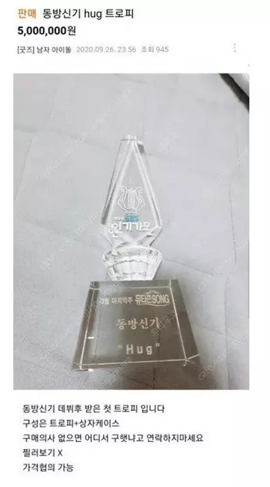 東方神起在2004年以歌曲《Hug》出道,出道就成功取下一位獎座,五位成員在舞台流下感動的淚水,令到不少粉絲印象深刻。近日在一個二手市場發現了有人以500萬韓幣出售該獎座,賣家更表明:「如果不是打算購買的人,請不要再問我怎樣得到這個獎座。」
