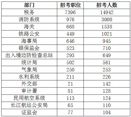 對部門招錄情況進行統計分析發現,本次招錄稅務、消防系統、海關、鐵路公安、海事局、銀保監會、入境邊防檢查總站、統計局、氣象局、水利系統、外交部、審計署、民用航空系統、長江航運公安局、證監會等15大部門(系統)共招錄2.4萬人,佔總招錄人數的95%。其中稅務系統招錄人數最多,接近1.5萬人,佔總招錄人數的58%。