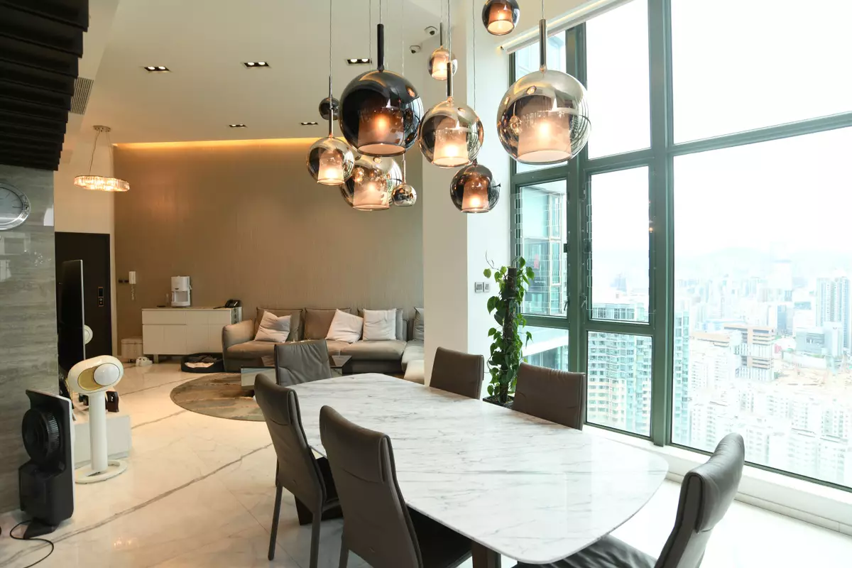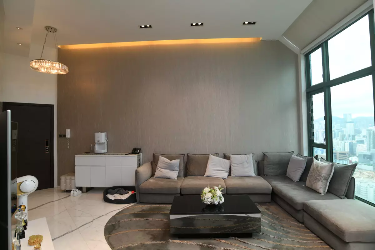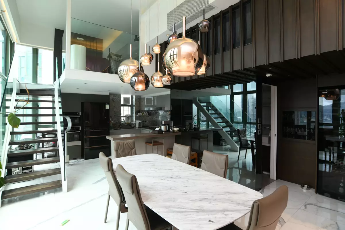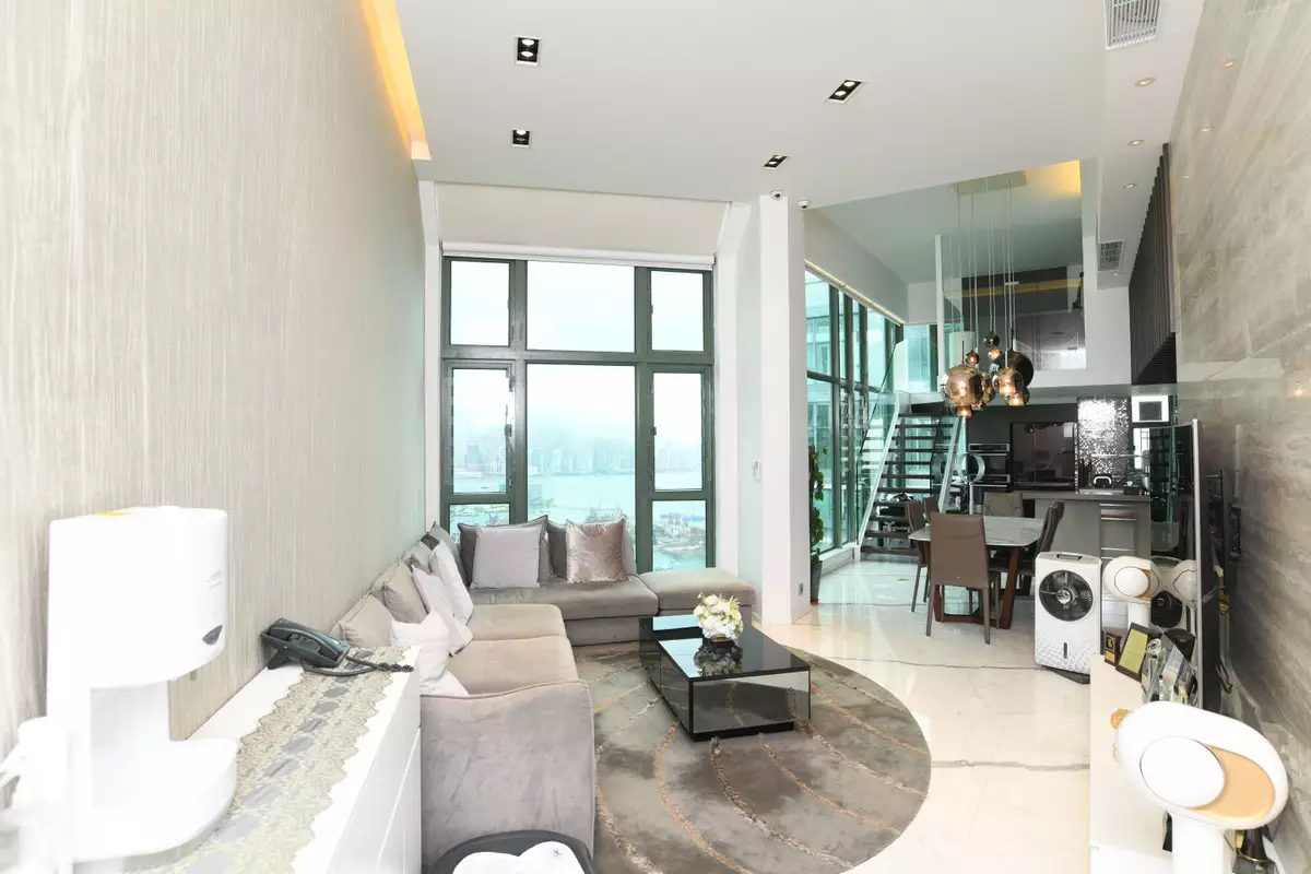 立刻帶各位走訪這個罕有複式放盤,位於2座頂層,坐向東南,實用面積1523方呎。此特色戶配有簇新華麗裝潢,複式上層樓底高約18呎,而下層樓底則高約16呎,充分體現豪宅格局與氣派。廳堂位處複式下層,甫入屋內,客廳的地板帶有直條紋理,配上弧形地毯及絲絨沙發組合,為一室增添高雅格調,飯廳位置為中空設計,懸掛着的圓形吊燈,令原本高曠的廳堂更顯空間感。兩廳分別裝有巨形玻璃窗,透視維港煙花美景及新油麻地避風塘海景,視野遼闊。
