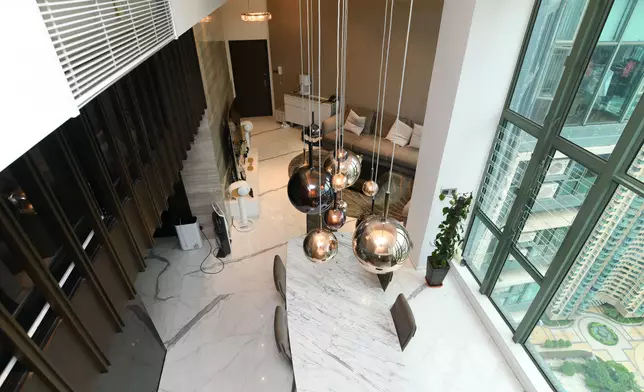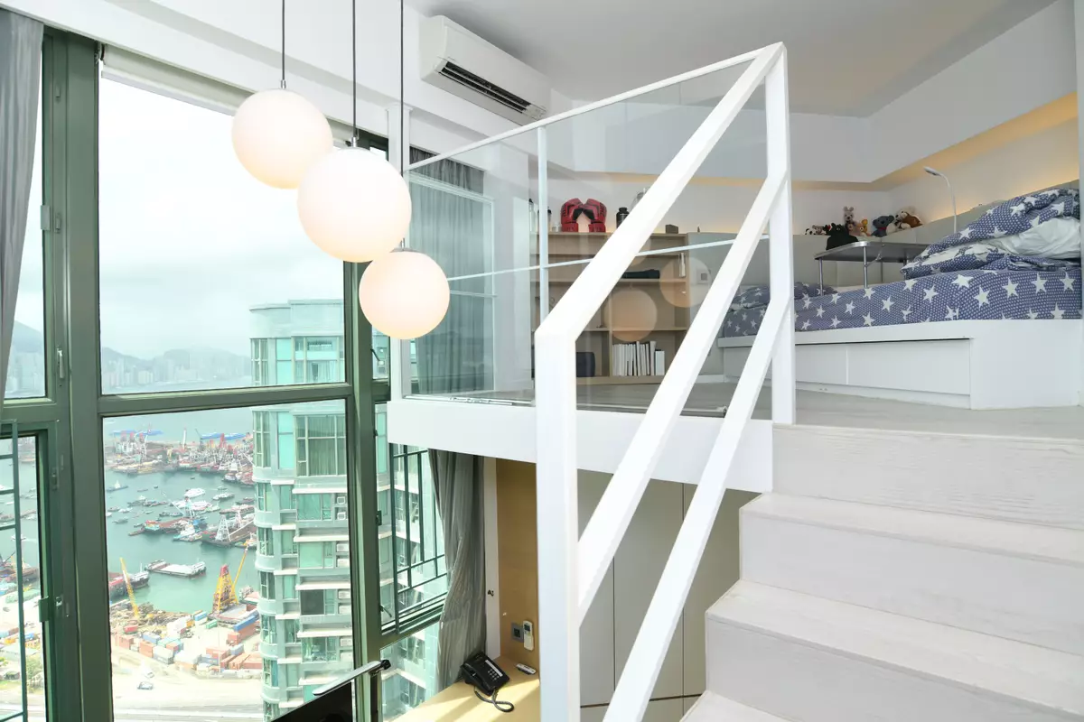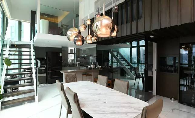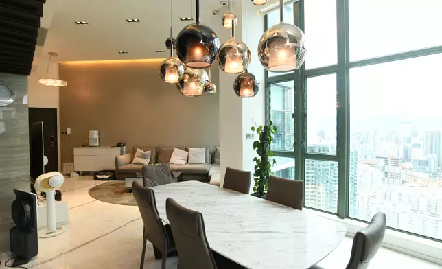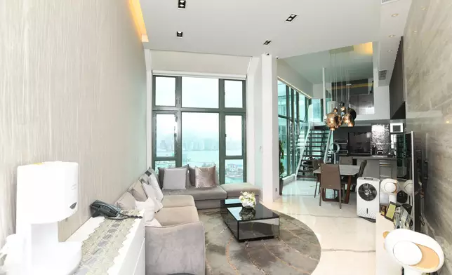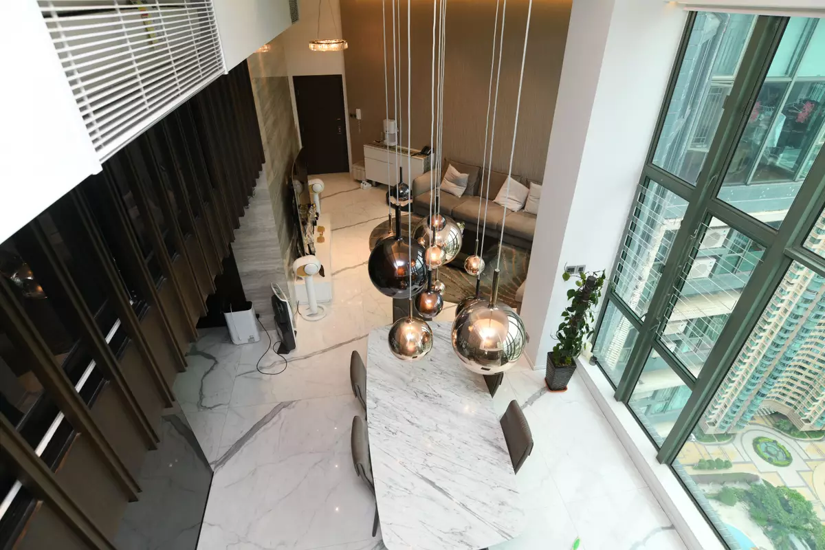 立刻帶各位走訪這個罕有複式放盤,位於2座頂層,坐向東南,實用面積1523方呎。此特色戶配有簇新華麗裝潢,複式上層樓底高約18呎,而下層樓底則高約16呎,充分體現豪宅格局與氣派。廳堂位處複式下層,甫入屋內,客廳的地板帶有直條紋理,配上弧形地毯及絲絨沙發組合,為一室增添高雅格調,飯廳位置為中空設計,懸掛着的圓形吊燈,令原本高曠的廳堂更顯空間感。兩廳分別裝有巨形玻璃窗,透視維港煙花美景及新油麻地避風塘海景,視野遼闊。
