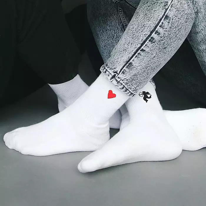 設計理念:一顆心,一支箭在襪子同側,當我們走在街口,隨著步伐,看到邱比特追逐著心,雙腿靠近時看似要追上了,但踏出另一步後卻又有了距離,時而近時而遠,像極了愛情。