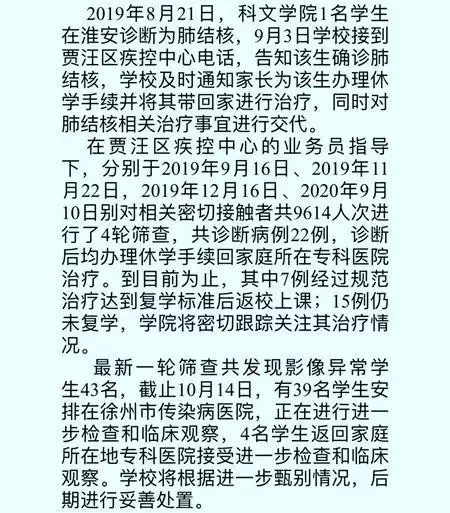 在賈汪區疾控中心業務員的指導下,學校分別於2019年9月16日、2019年11月22日、2019年12月16日、2020年9月10日對相關密切接觸者共9614人次進行了4輪篩查,共診斷病例22例,診斷後均辦理休學手續回家庭所在專科醫院治療。到目前為止,其中7例經過規範治療達到復學標準後返校上課;15例仍未復學,學院將密切跟蹤關注其治療情況。最新一輪篩查共發現影像異常學生43名。