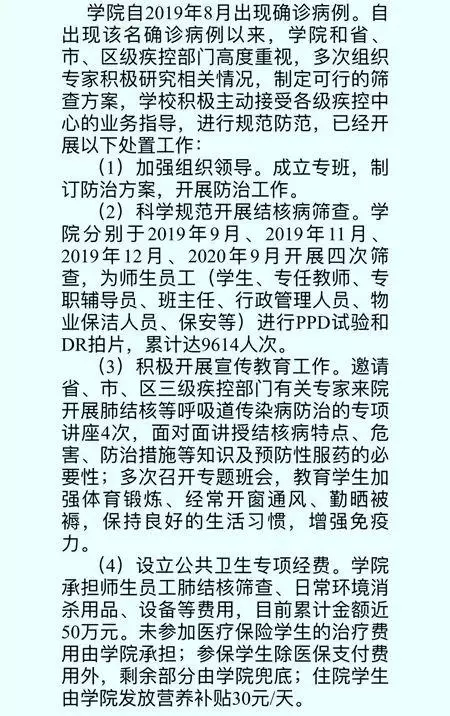 相關費用由學院承擔,其中包括師生員工肺結核篩查、日常環境消殺用品、設備等費用。未參加醫療保險學生的治療費用由學院承擔;參保學生除醫保支付費用外,剩餘部分由學院兜底;住院學生由學院發放營養補貼30元/天。