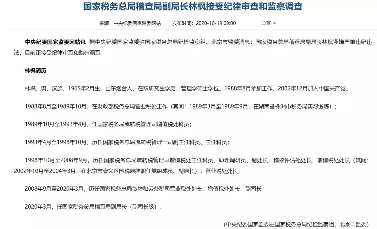 國家稅務總局稽查局副局長林楓涉嫌嚴重違紀違法,目前正接受紀律審查和監察調查。