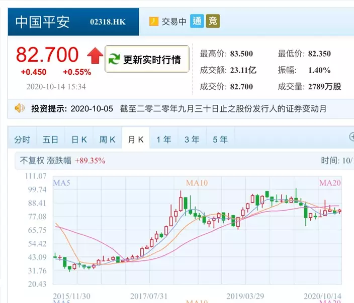2018年1月,中國平安(2318)股價在港衝上92.2元歷史新高,兩年多後的今天,股價還要比當時低,只得82.7元!