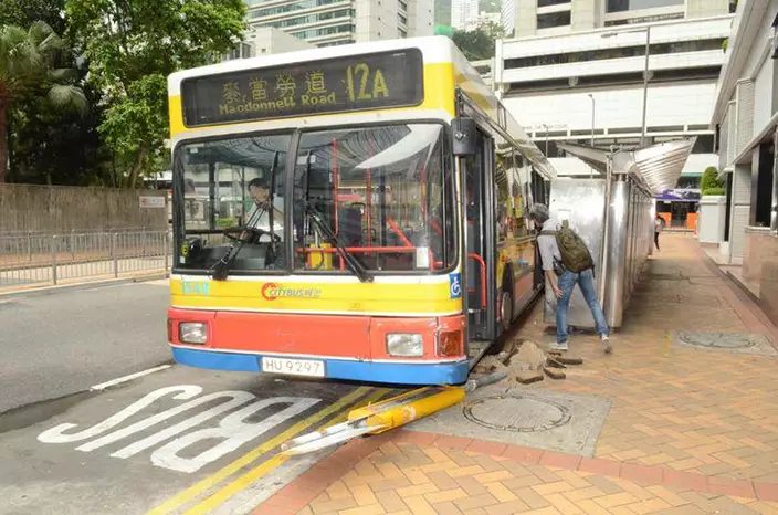 肇事的城巴12A路綫單層巴士來往金鐘(添馬街)及半山麥當勞道。早上8時許,巴士駛至金鐘道添馬街時,與一輛旅遊巴發生碰撞,由於撞力過猛,巴士剷上行人路,撞毀一個巴士站牌才停下。意外中,一男一女乘客受傷,送院治理。警方正調查意外原因。