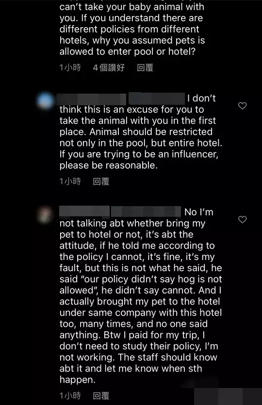 有前酒店員工事後在網上討論區公開事件,並表示酒店政策有列明不允許酒店以外的寵物進入酒店範圍,指責港女無理。又有網民到該名港女的社交網站留言指責,告知港女不單是泳池不容許其他寵物入內,是不允許住戶帶其他動物進入酒店。惟港女留言回覆解釋,她不是在意酒店能否讓她帶寵物入內,而是不滿酒店職員的態度,又指若職員直接告知她不可以帶其寵物入內,她會接受,惟該名酒店職員沒有,亦不了解酒店政策,又稱「我為我的旅程付款,我不需要了解酒店的政策(I paid for my trip. I don t need to study their policy.)」,認為了解政策的責任在於酒店職員。