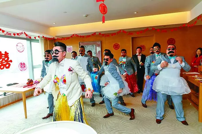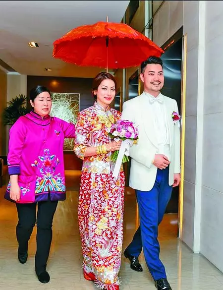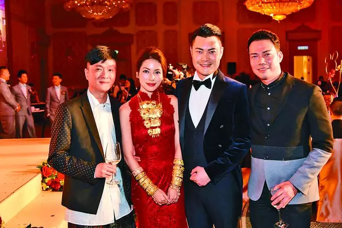 今年三月一日,林家在迪士尼樂園酒店筵開100席大宴親朋,政商界名人、謝天華及陳浩民等均有到賀,記者從特別渠道取得當日照片,穿上裙褂的Jessie笑得幸福,獲奶奶送贈大串金豬牌外,三吋闊的龍鳳環更一字排箍滿兩隻手臂,而近年往內地發展的趙彤、Ann Ho及有「翻版徐子淇」之稱的索模Zelia則擔任姊妹團陪嫁。