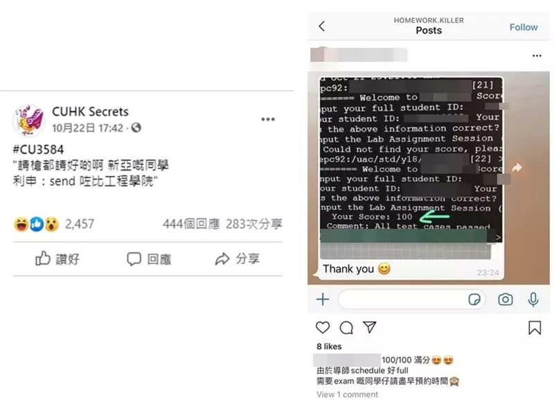 Facebook專頁「CUHK Secret」上周貼出一則學生投稿,並附上代做功課網店的宣傳對話截圖,對話懷疑將「請槍」同學的資料曝光,帖文中提及「請槍都請好啲啊,新亞嘅同學。利申:Send咗畀工程學院」,並聲稱已通知學校有關部門。